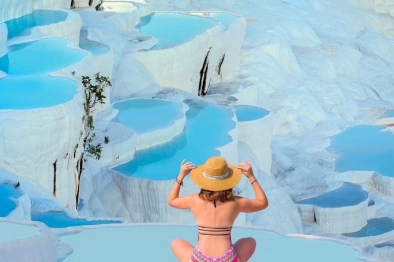 13h30: Tiếp tục đến với Pamukkale (~400km, ~5 giờ di chuyển) - Đây là một điểm đến hấp dẫn nhất nhì Thổ Nhĩ Kỳ bởi vẻ đẹp khó tin chỉ xuất hiện trong những bộ phim khoa học viễn tưởng của nó. Nếu chỉ nhìn trên ảnh hay những thước phim từ trên cao, người ta dễ nhầm lẫn đây là một núi tuyết khổng lồ nhưng thật ra đó chính là một vùng núi đá vô canxi cacbonic được tích tụ hàng nghìn năm với hình dáng như những hồ nước xếp thành từng tầng được tạo thành bởi quá trình biến đổi. Nước trong những “hồ bông” này là nước khoáng tự nhiên được hình thành từ mạch khoáng ngầm với màu xanh da trời và chứa nhiều khoáng chất có lợi cho sức khỏe và có thể hỗ trợ chữa bệnh. Ở Pamukkale có đến 17 suối nước nóng với nhiệt độ từ 35 - 100 độ nên từ lâu người ta đã biết tận dụng để mở các dịch vụ spa, nghỉ dưỡng để phục vụ du khách.